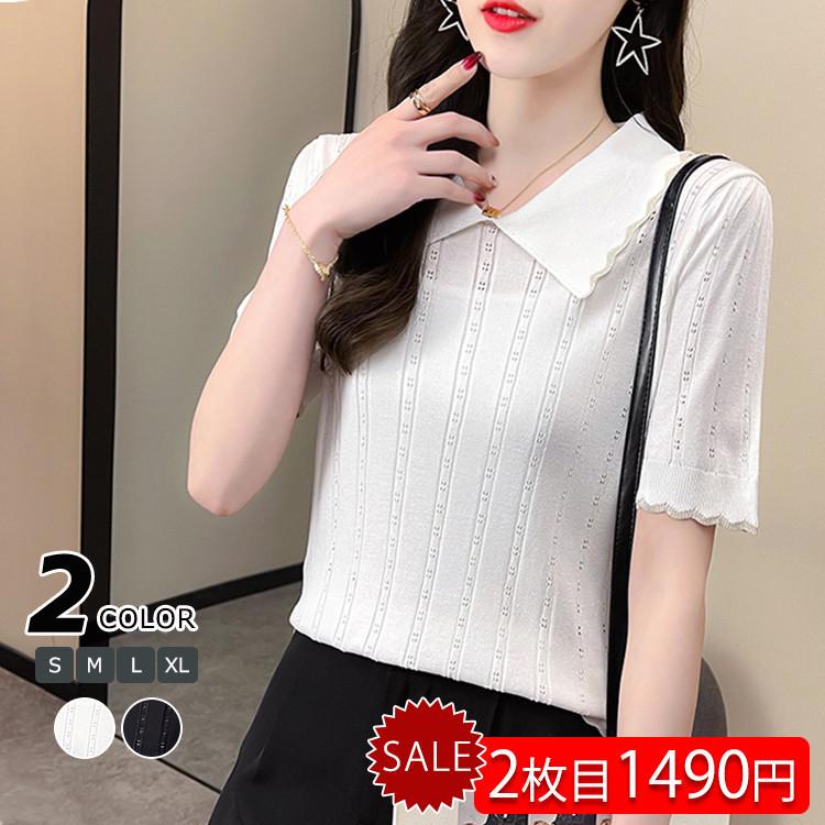 サマーニット レディース トップス 襟付き スカラップ フリル 半袖 薄地 夏コーデ スリム 細身 カジュアル Tr